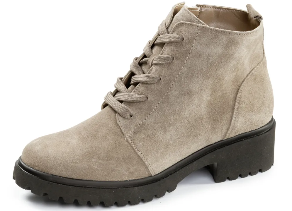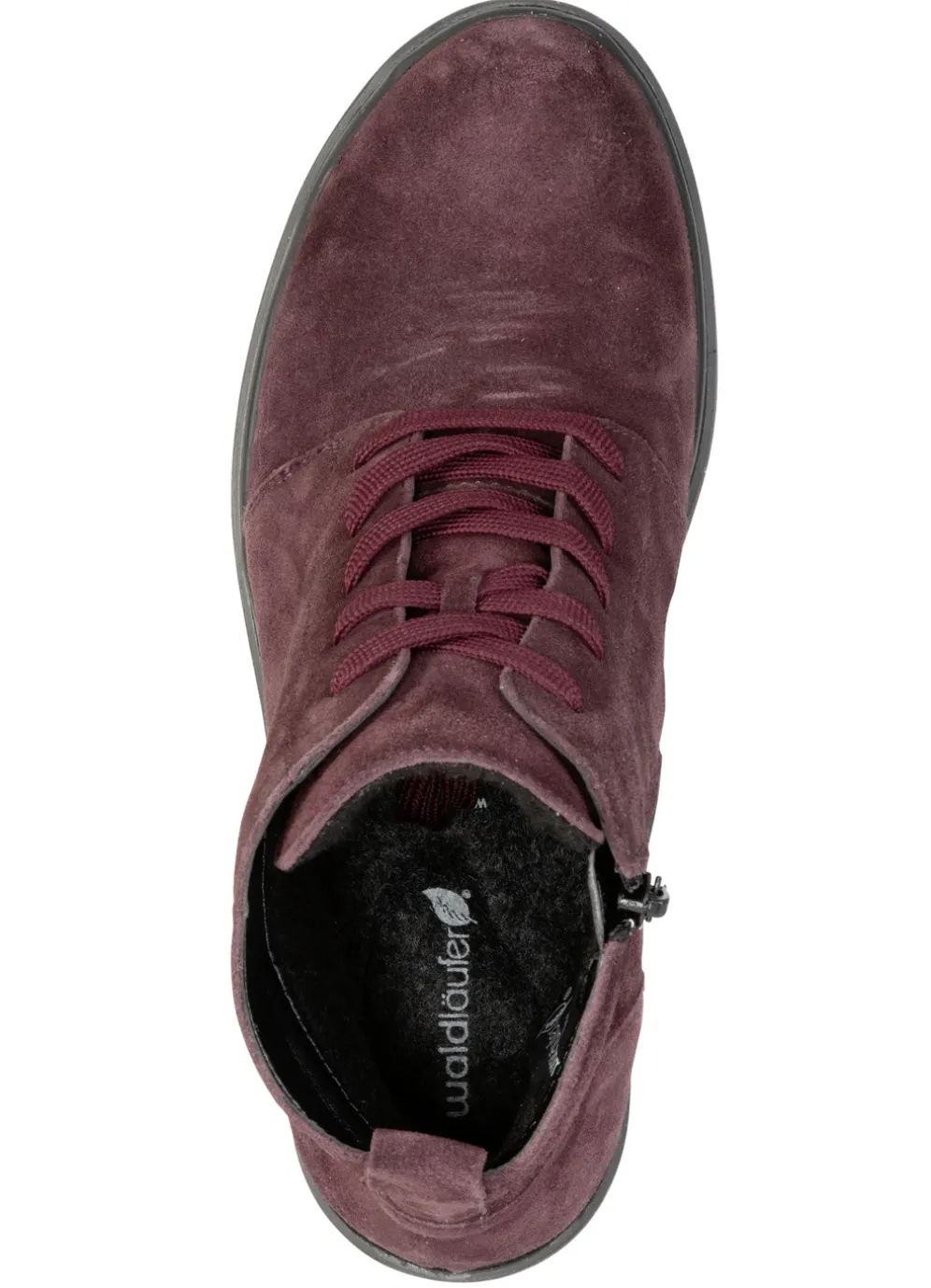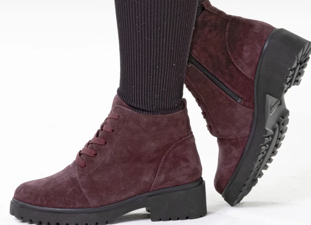 Stiefeletten aus weichem Veloursleder, mit Schnürung und praktischem Innenreißverschluss: Weite H, wärmendes Textilfutter, herausnehmbares Filz-Fußbett, leichte EVA-Profilsohle sowie 30 mm Absatz. Schafthöhe ca. 11 cm