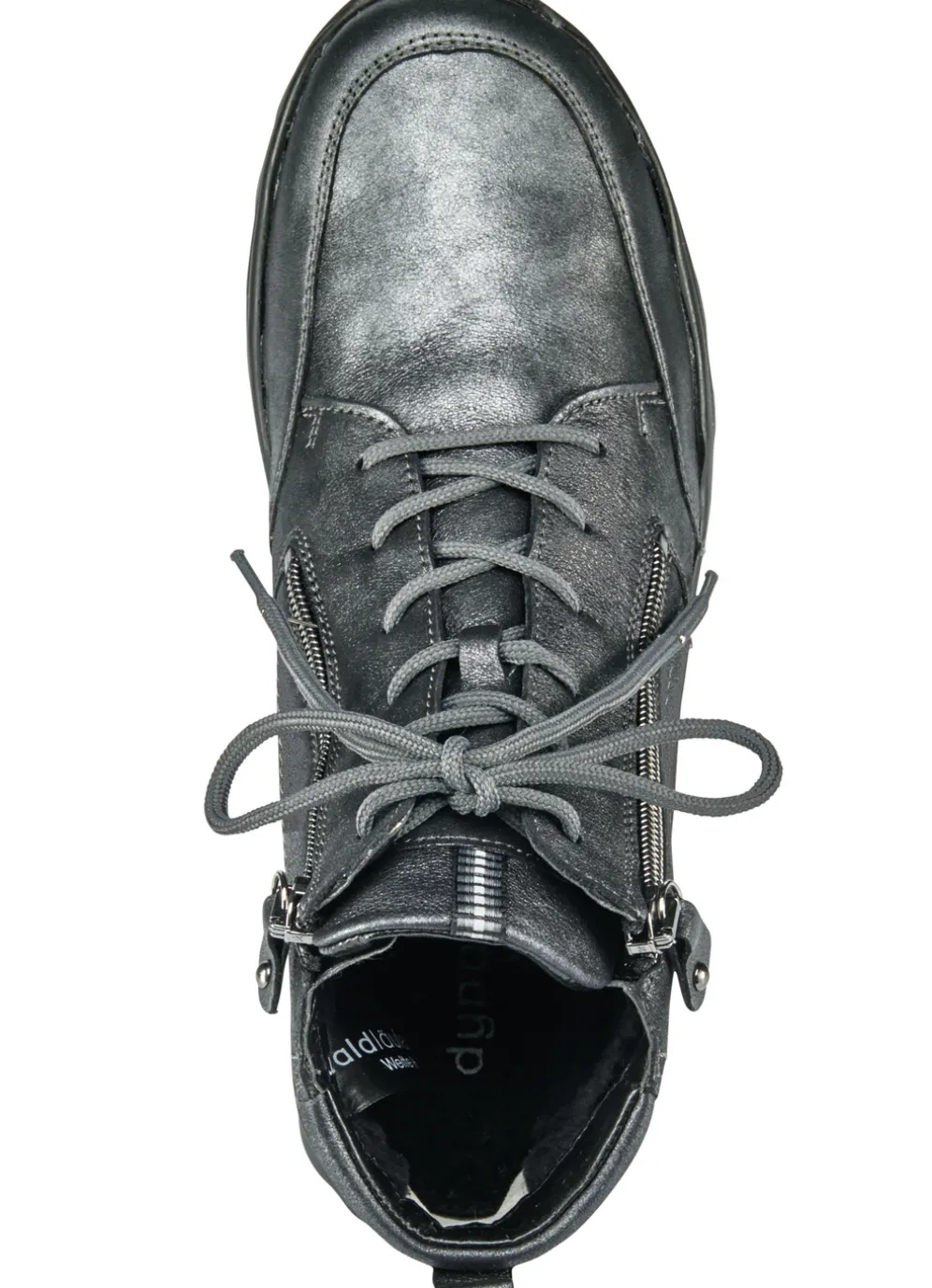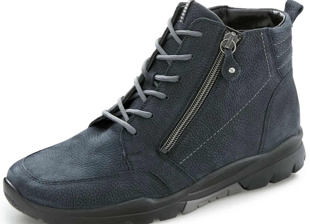 Stiefeletten aus bestem Kalb-Nubukleder oder teilweise geprägtem Veloursleder, mit Schnürung und zwei Seitenreißverschlüssen: in Weite H, Warmfutter aus 100% Baumwolle, herausnehmbares Fußbett, superleichte PU-Profilsohle mit bester Abrollfunktion und breiter Auftrittsfläche, daher Gelenk unterstützend, 20 mm Keilabsatz. Schafthöhe ca. 10 cm