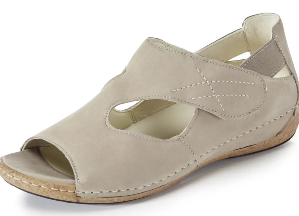 Hochwertige Sandale aus edlem Rind-Nubukleder: in Weite H, verstellbare Klettspange, Lederfutter, herausnehmbares Lederfußbett, leichte PU-Riffelsohle sowie 25 mm Keilabsatz