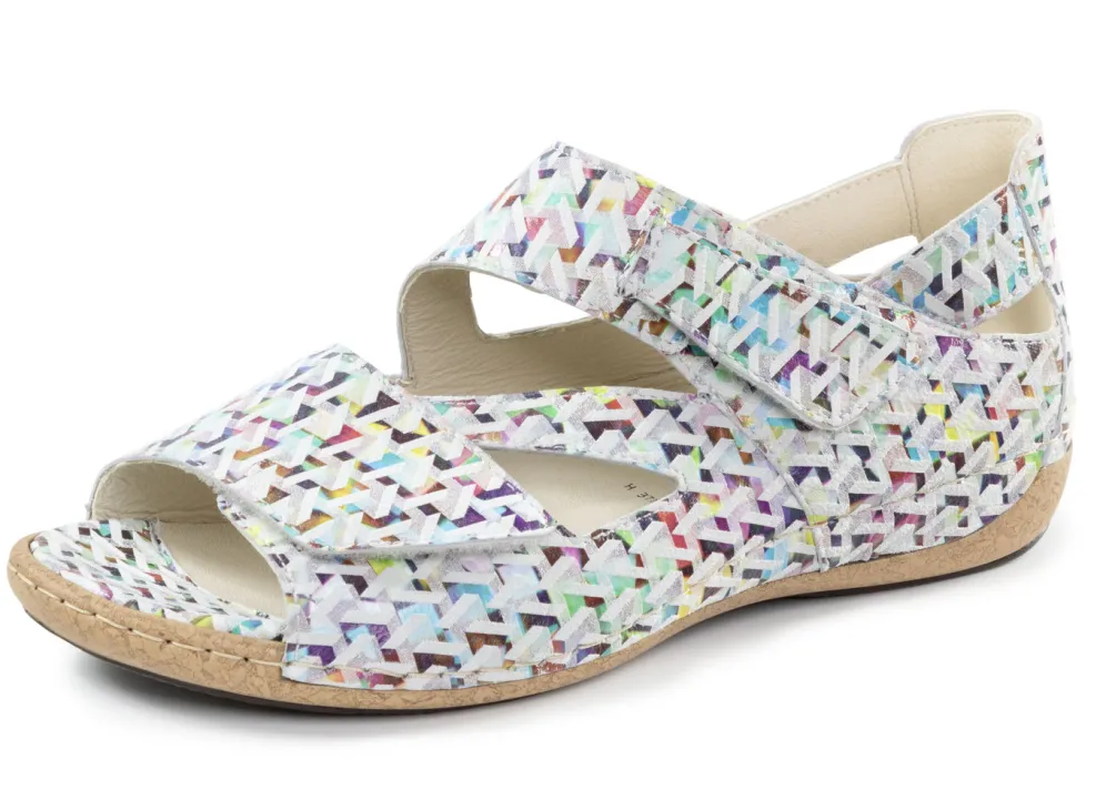 Sandale in Ecru-Bunt, aus effektvoll bedrucktem Nubukleder, mit zwei praktischen Klettspangen: Weite H, Lederfutter, herausnehmbares Lederfußbett, leichte PU-Riffelsohle sowie 25 mm Keilabsatz
