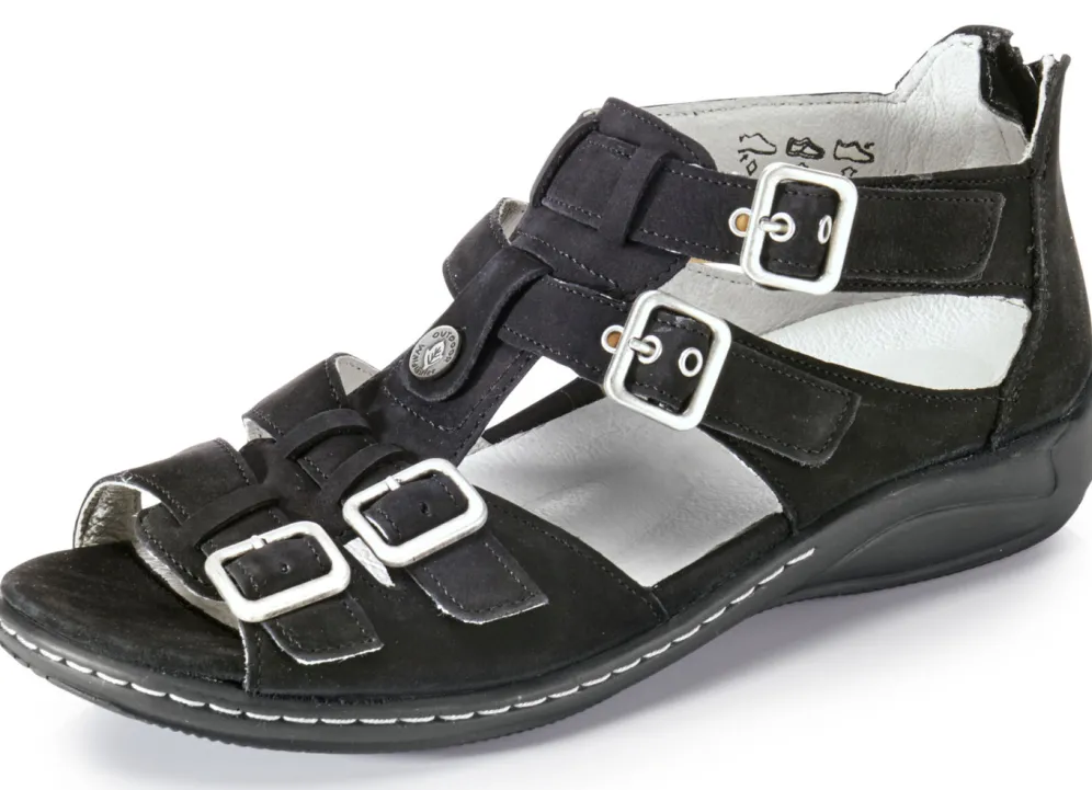 Sandale aus edlem Rind-Metallicleder, in Schwarz aus Rind-Nubukleder: Weite H, vier verstellbare Schließen, davon zwei mit Klettverschluss, Fersen-Reißverschluss, Lederfutter, herausnehmbares Lederfußbett, leichte PU-Riffelsohle sowie 25 mm Keilabsatz