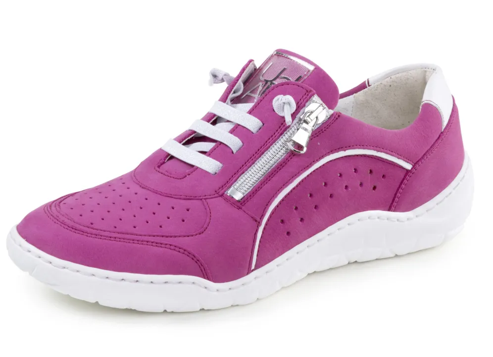 Sneaker aus Nubuk- oder Nappaleder, mit Perforation und seitlichem Reißverschluss: Weite K, schimmernde Elastik-Schnürung, ledergefüttertes Quartier, herausnehmbares Lederfußbett, leichte PU-Laufsohle sowie 15 mm Keilabsatz