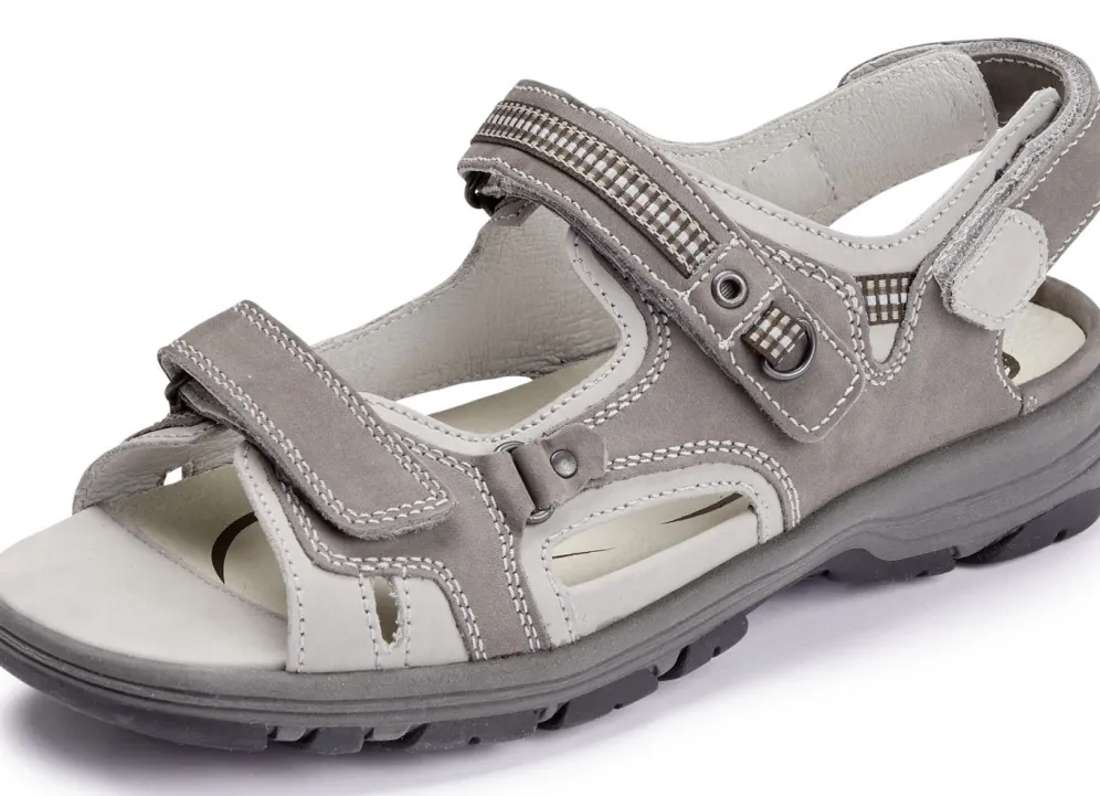 Sandalen aus Rind-Nubuk- oder Nappaleder, mit Textilbesätzen: Weite H, drei Klettspangen, Lederfutter, herausnehmbares Lederfußbett mit Fersenpolster, TR-Profilsohle, 20 mm Keilabsatz