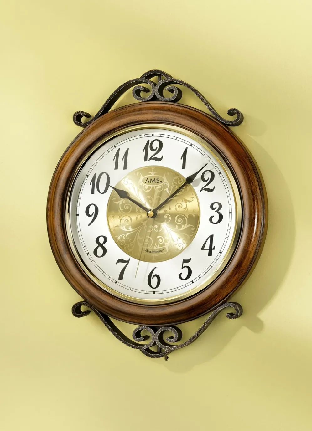schwarzen Metallzeigern. Präzises, leises Quarzwerk mit Westminster-Stundenschlag.