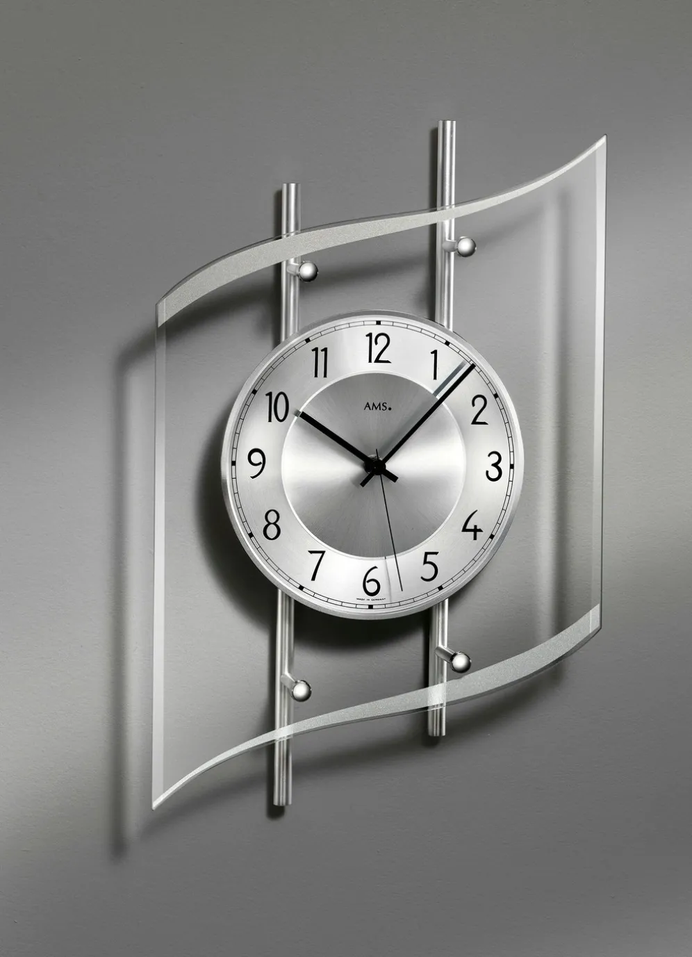 Edle, in Deutschland gefertigte Wanduhr mit hochwertigem Funkuhrwerk. Die Rückwand besteht aus zwei Metallstäben mit geschwungenem Mineralglas, das gold- bzw. silberfarben akzentuiert wurde. Metall-Zifferblatt mit arabischen Ziffern und Metallzeigern. Batteriebetrieben mit 1x 1,5 Volt Mignon (nicht im Lieferumfang enthalten). Maße: B29xH44,5x T7 cm
