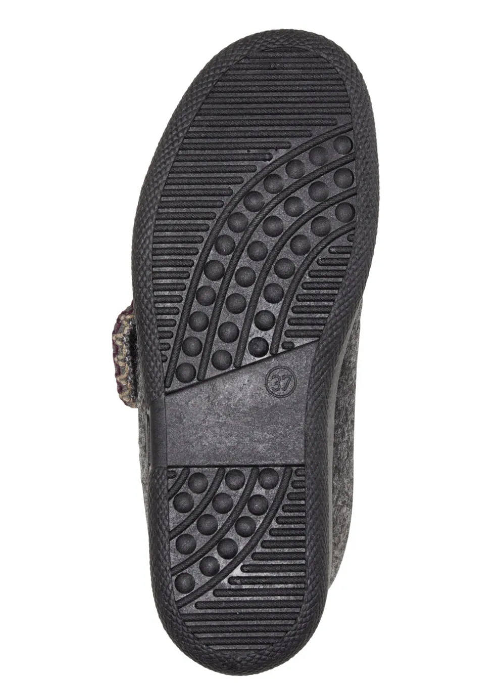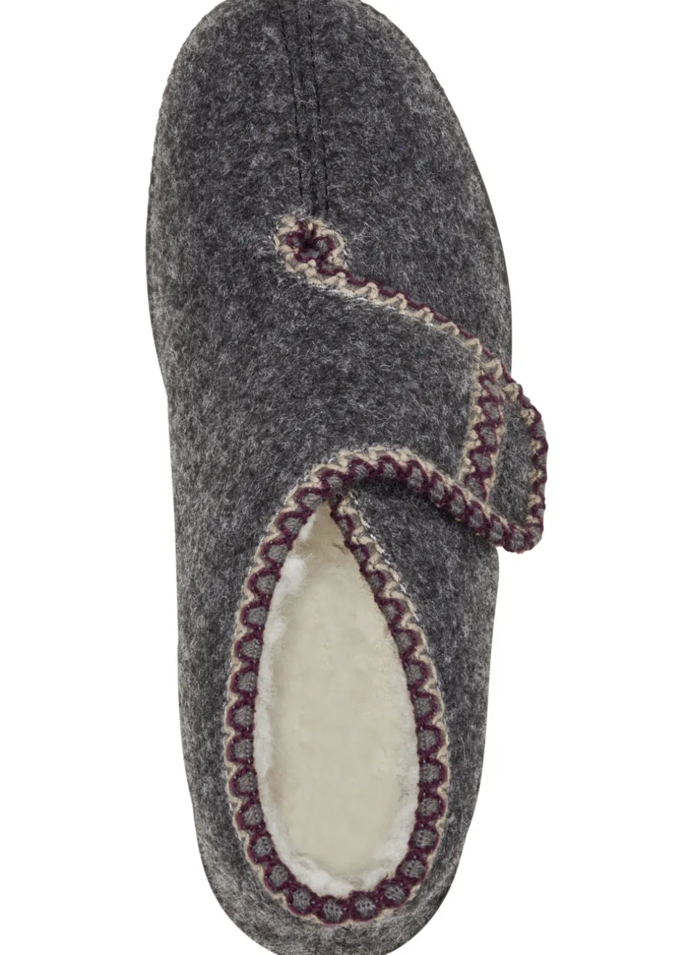 Hausschuhe aus weichem Filz mit Klettverschluss und gemusterter Bordüre: in Weite H, Warmfutter und Decksohlenbezug aus reiner Schurwolle, leichte PVC-Laufsohle sowie 15 mm Keilabsatz