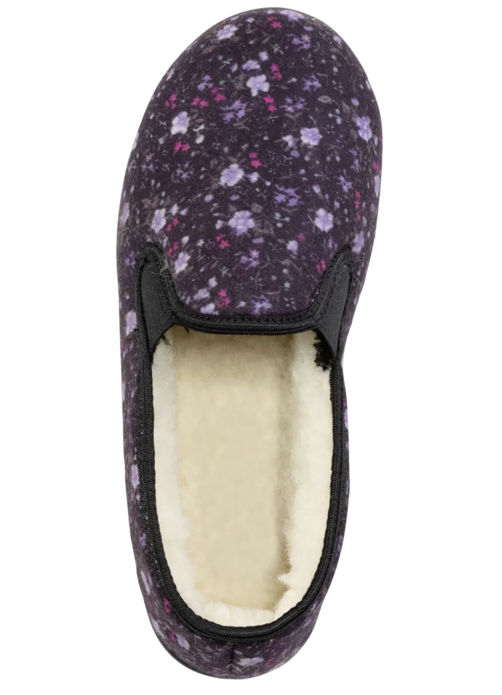 Mollige Hausschuhe aus floral bedrucktem, gepolstertem Textilmaterial: Weite H, seitliche Gummizüge, Warmfutter und Decksohle aus reiner Wolle, superleichte PU-Laufsohle, 15 mm Keilabsatz