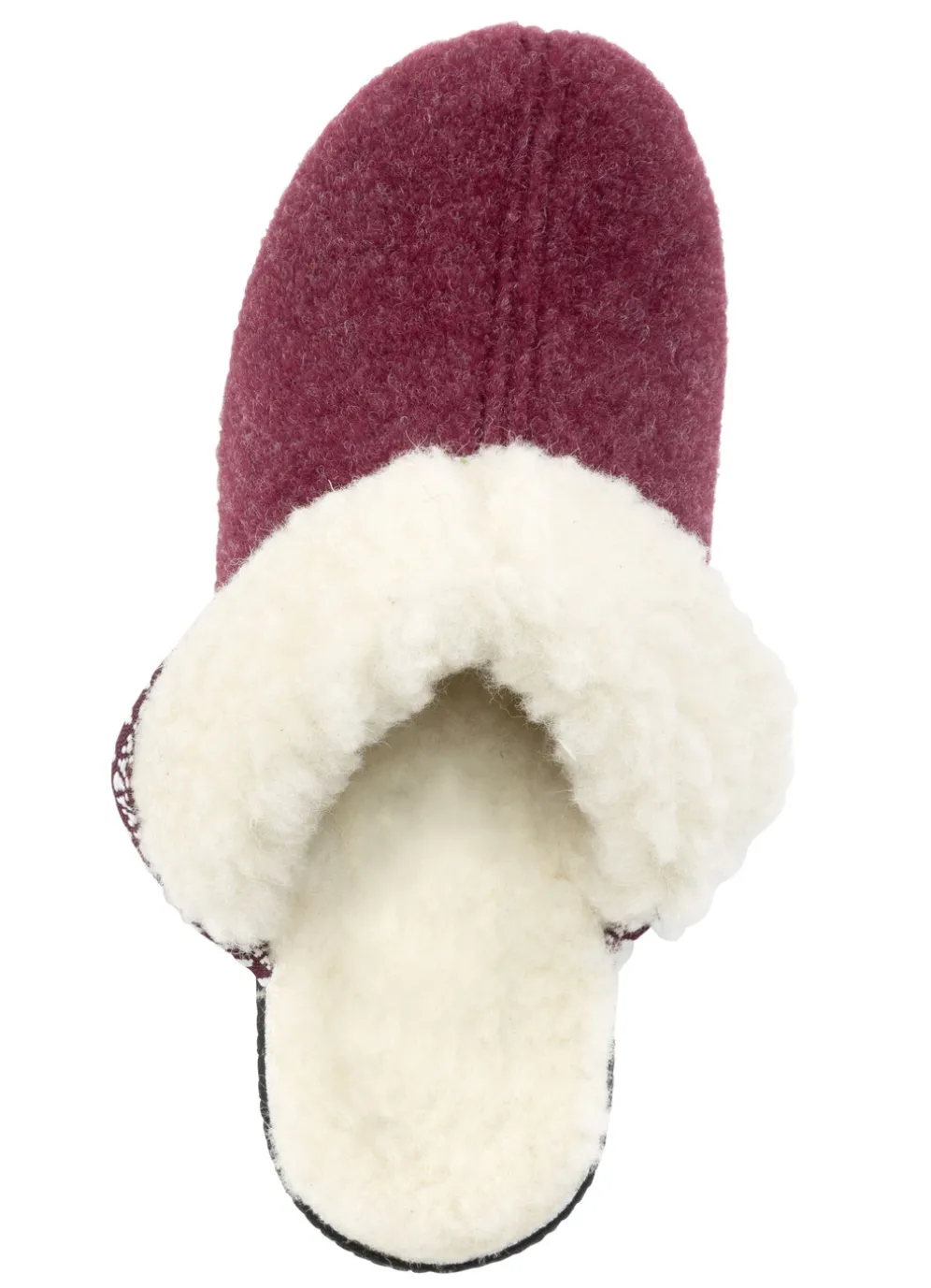 Hausschuhe aus weichem Filz: Weite H, Plüschkragen sowie Warmfutter und Decksohlenbezug aus reiner Wolle, superleichte PU-Laufsohle, 25 mm Keilabsatz