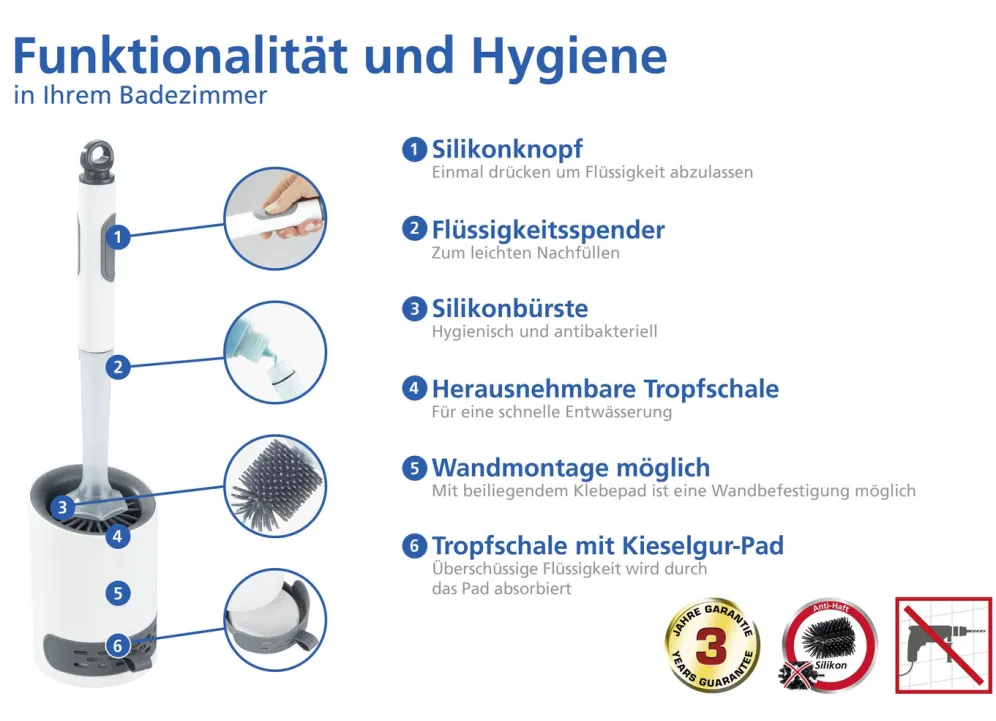 Innovative WC-Garnitur mit integriertem Reinigungsmittel-Spender. Dank der praktischen 2in1 Funktion lässt sich mit dieser WC-Bürste die Toilette bequem und gründlich reinigen. Der im Bürstenstiel integrierte, leicht nachfüllbare Reinigungsmittel-Spender gibt auf Knopfdruck die richtige Dosis an Reinigungsmittel ab und ermöglicht so eine schnelle und hygienische WC-Reinigung. Die Toilette bleibt stets sauber und frisch. Überschüssige Flüssigkeit wird durch das im Boden des Bürstenhalters integrierte Kieselgur-Pad absorbiert, sodass keine Rückstände und Gerüche entstehen. Bei nachlassender Saugfähigkeit und zum Entfernen von Schmutz einfach das Kieselgur-Pad mit Schleifpapier vorsichtig abreiben.