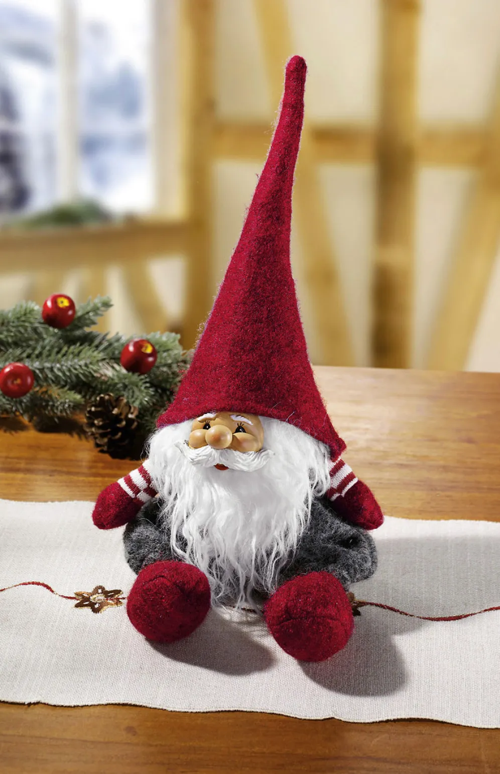 Dieser putzige Wichtel in seiner grau-roten Kleidung sollte in keiner Weihnachtsdekoration fehlen! Sein Gesicht wurde aus Polyresin gefertigt, seine Arme und Beine sowie die lange Mütze sind aus Filz. Maße: Höhe ca. 37 cm.