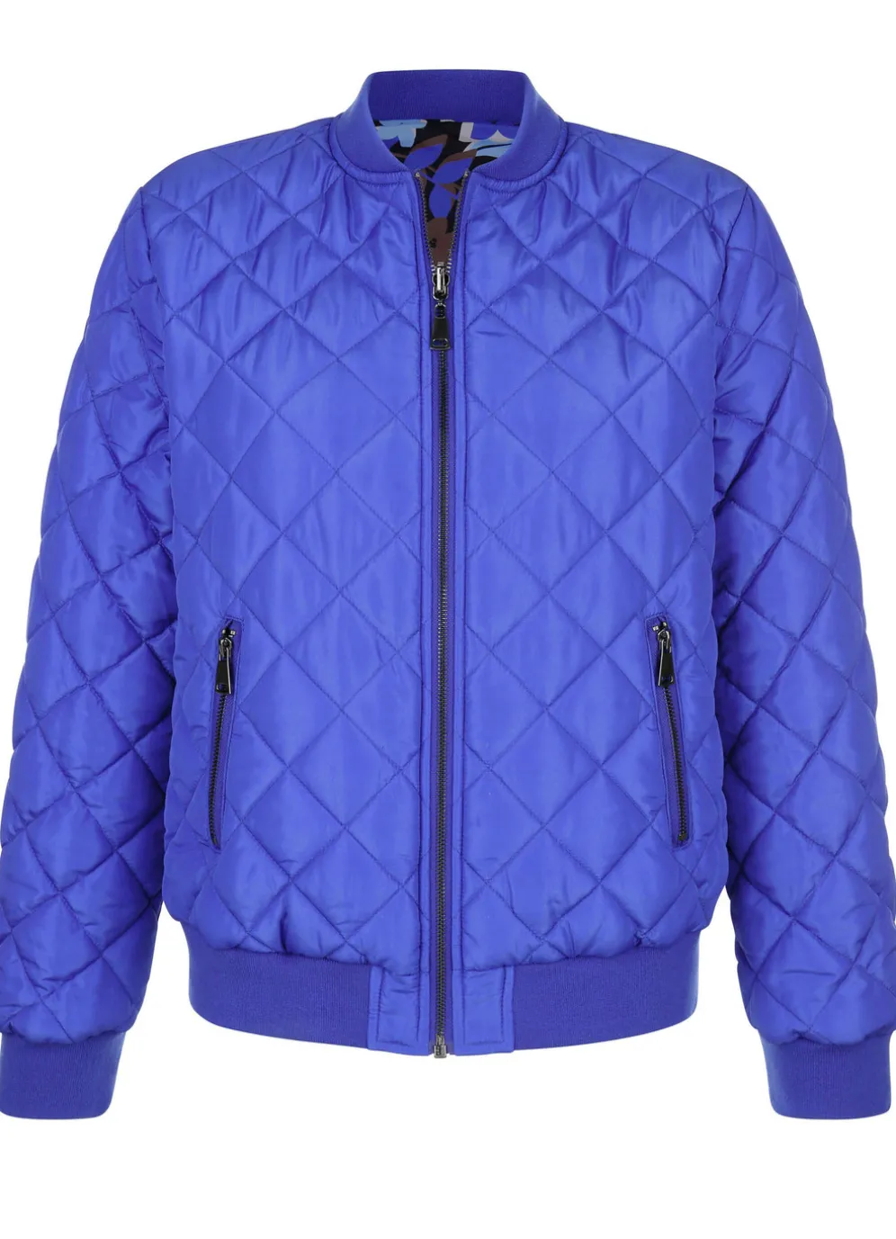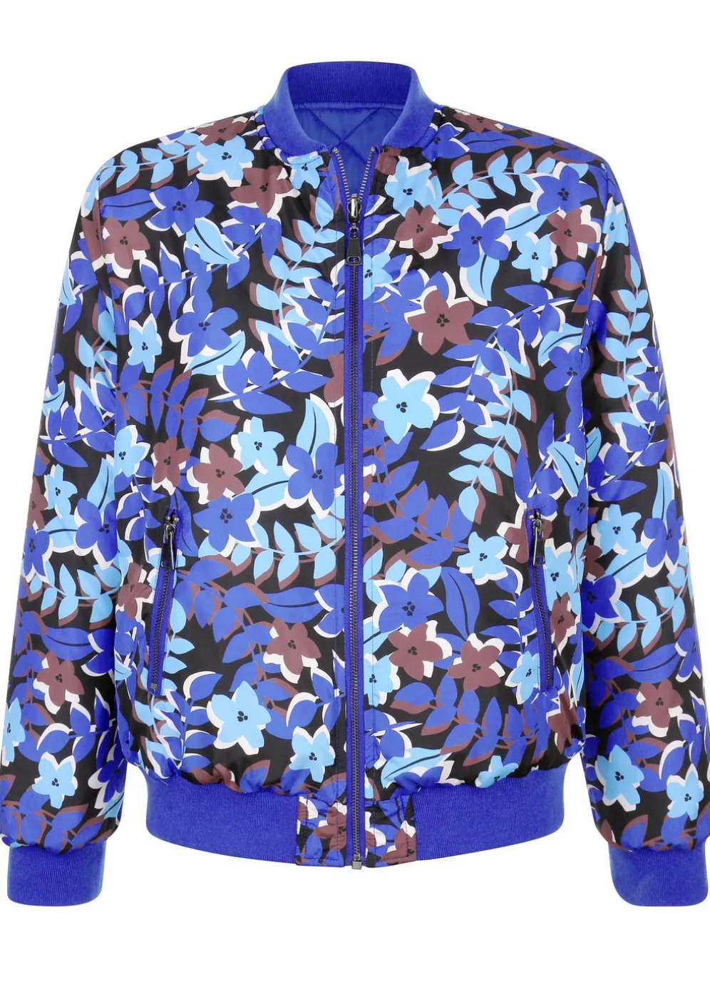 Wendeblouson mit Rippenstrickbündchen am runden Halsausschnitt, an den Ärmelabschlüssen und am Saum, Reißverschlussleiste sowie Reißverschlusstaschen. Eine Seite mit Floralprint in Royalblau-Braun-Türkis-Naturweiß auf schwarzem Fond, die andere gesteppte Seite in uni Royalblau. Länge ca. 59 cm.