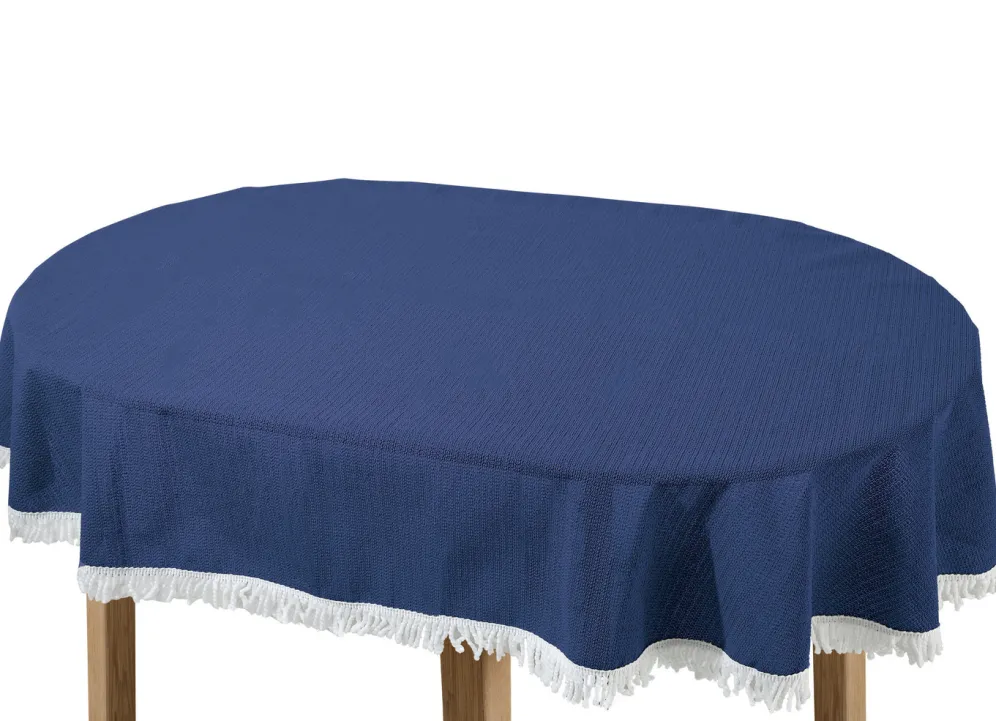 Wind- und wetterfeste Gartentischdecke mit Fransenabschluss in Größe 110 (Tischdecke, 110×140 cm) und in Blau.
