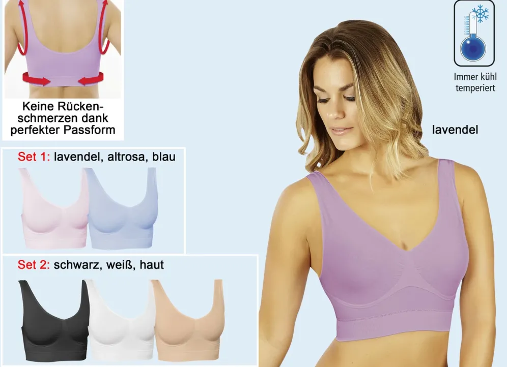 Dieser Wohlfühl-BH bietet dank der nahtlosen Verarbeitung und der einzigartigen Kühlfaser den idealen Tragekomfort an heißen Tagen! Dank der Cooltex-Mikrofaser wirkt dieser BH wärmeabweisend und sorgt für ein angenehmes und kühlendes Hautklima. Dabei kommt er ganz ohne störende Bügel, Klammern oder Haken aus. Die extra breiten Komfortträger sowie das Brustgummi sorgen für einen optimalen Halt. Durch den figurformende Shape-Effekt passt es sich Ihrem Körper perfekt an. Qualität: Cooltex-Mikrofaser aus 94% Polyamid, 6% Elastan.
