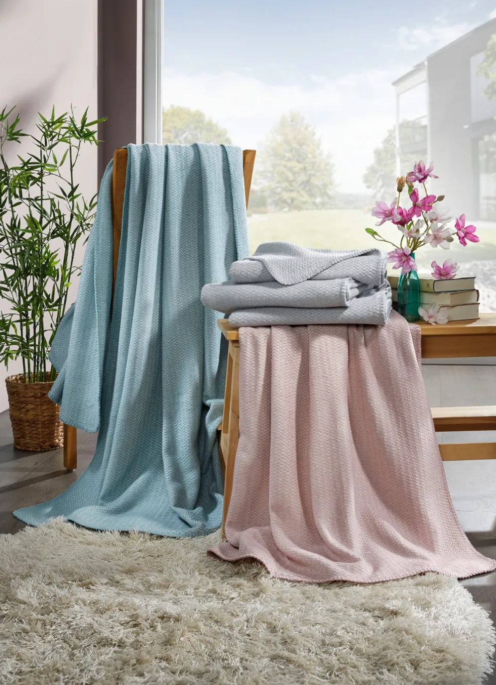 Äußerst angenehme Wohndecke mit Zick-Zack-Dessin! Die Decke ist mit Festonstich gearbeitet. Aus 60% Baumwolle und 40% Polyacryl. Maße: 150×200 cm
