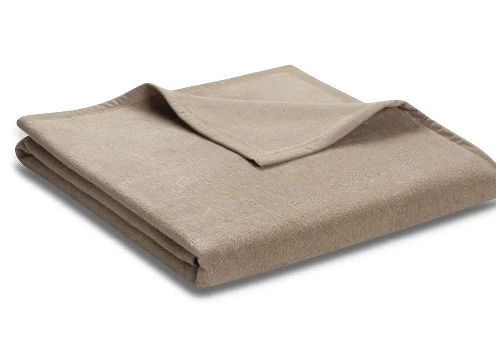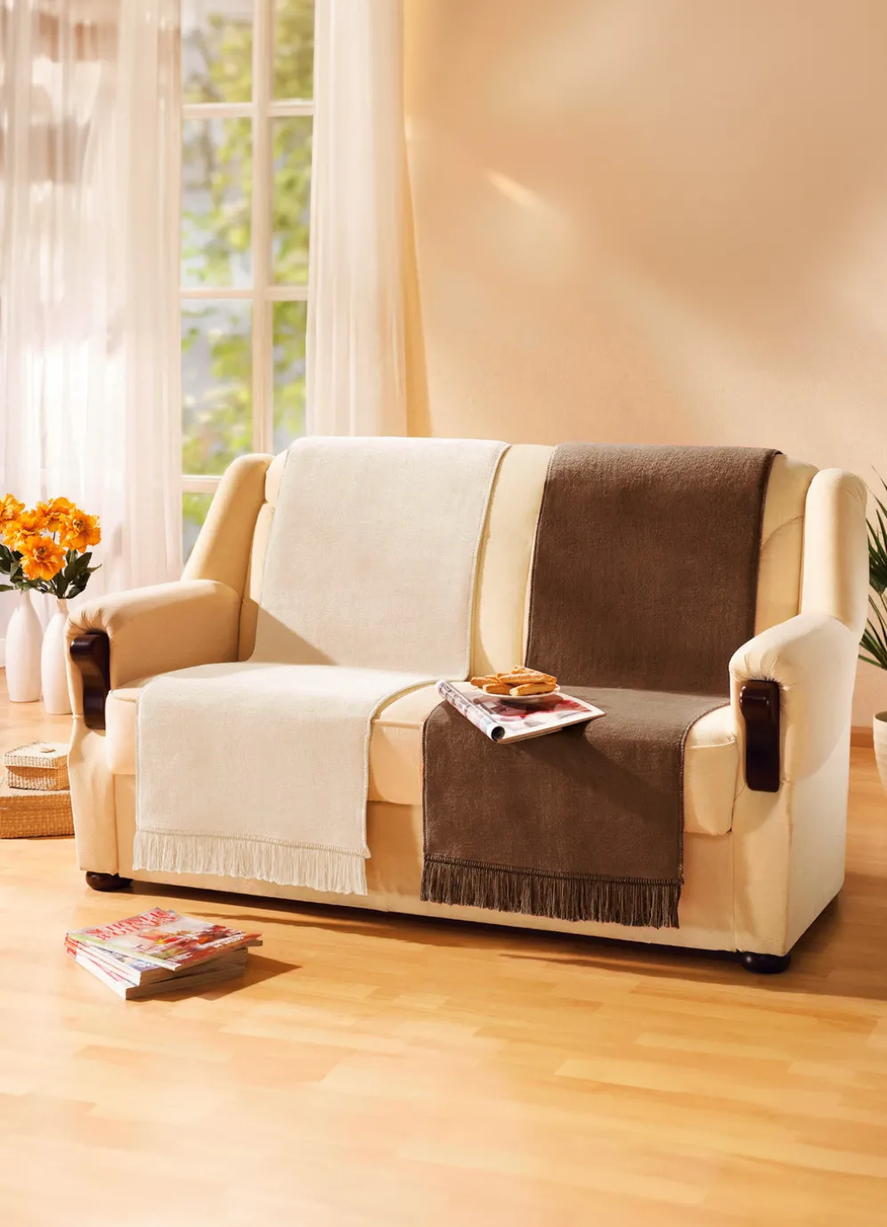 Wohndecke und Sesselschoner mit Fransenabschluss in Größe 102 (Sesselschoner, 50×200 cm) und in Camel.