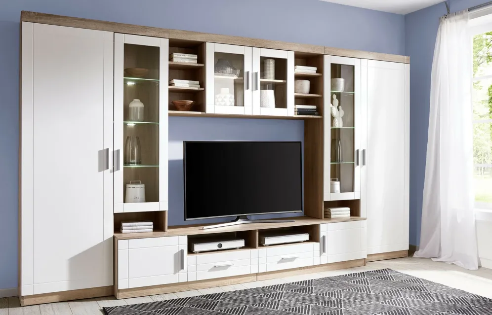Wohnwand mit LED-Glasbodenbeleuchtung in Weiss Eiche Sonoma und ohne Aufbauservice.