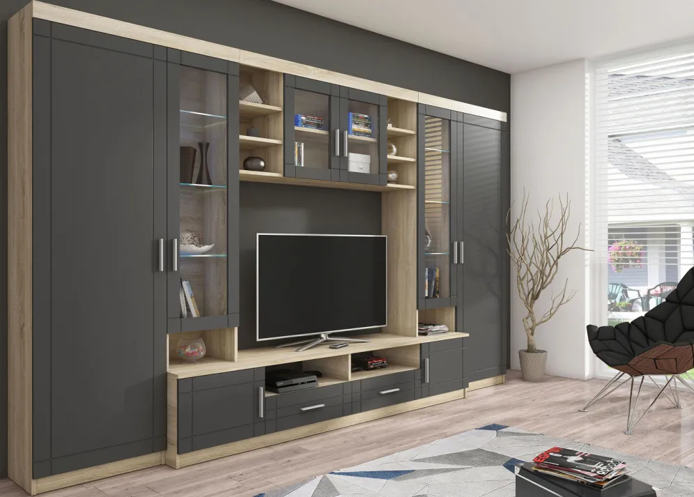 Moderne Wohnwand mit viel Stauraum und profilierten MDF-Fronten. In Weiß-Eiche Sonoma, Grau-Eiche Sonoma oder komplett in Eiche Sonoma. Mit LED-Glasbodenbeleuchtung (nicht austauschbar) und Schubladen mit Metalllaufleisten.