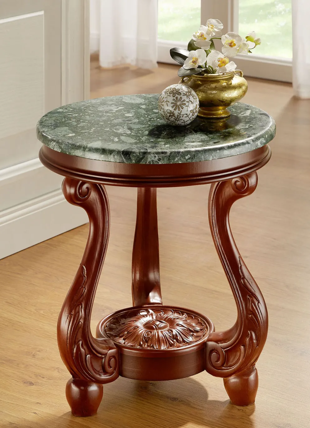 Setzen Sie einen royalen Akzent in Ihrem Wohnraum! Mit diesem schön gearbeiteten, teilmassiven Beistelltisch gelingt Ihnen das spielend. Das filigran geschwungene Gestell mit reichhaltiger Schnitzerei aus nussbaumfarbenem Buchenholz wird veredelt durch die hochwertig gestaltete Tischplatte aus echtem Marmor-Konglomerat (leichte Endmontage) in Grün oder Rosa. Maße: ø 42 cm, Höhe 46 cm. Die Lieferung erfolgt aufgebaut