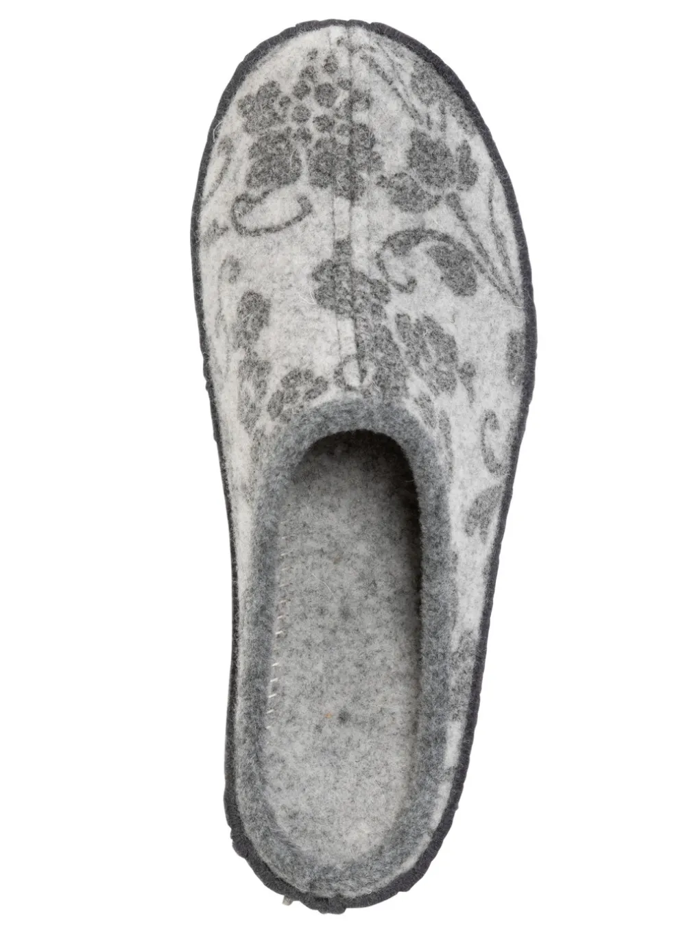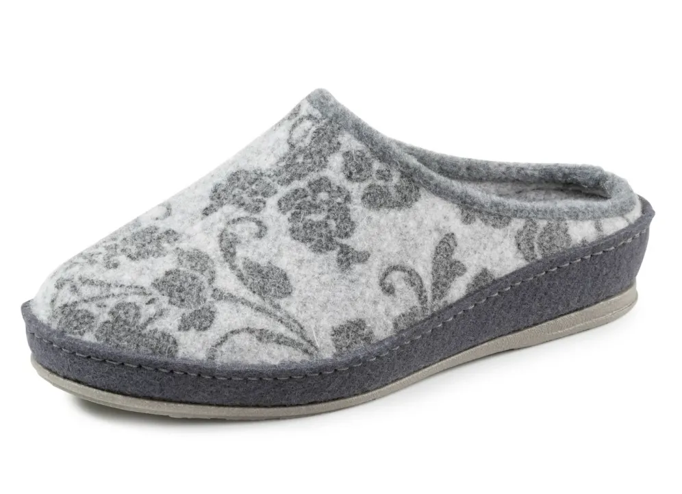 Wollfilz-Pantoffel mit floralem Druck in Grau und in Größe 41.