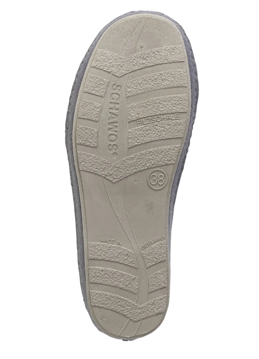 Grauer Wollfilz-Pantoffel mit floralem Druck: Wollfilz-Fußbett mit Fersenluftpolster, Filzschalensohle, TR-Laufsohle sowie 25 mm Keilabsatz