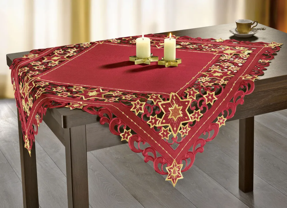 Wunderhübsch bestickte Tischdekoration in Größe 130 (Stern, 2er-Set, ø 30 cm) und in Rot.