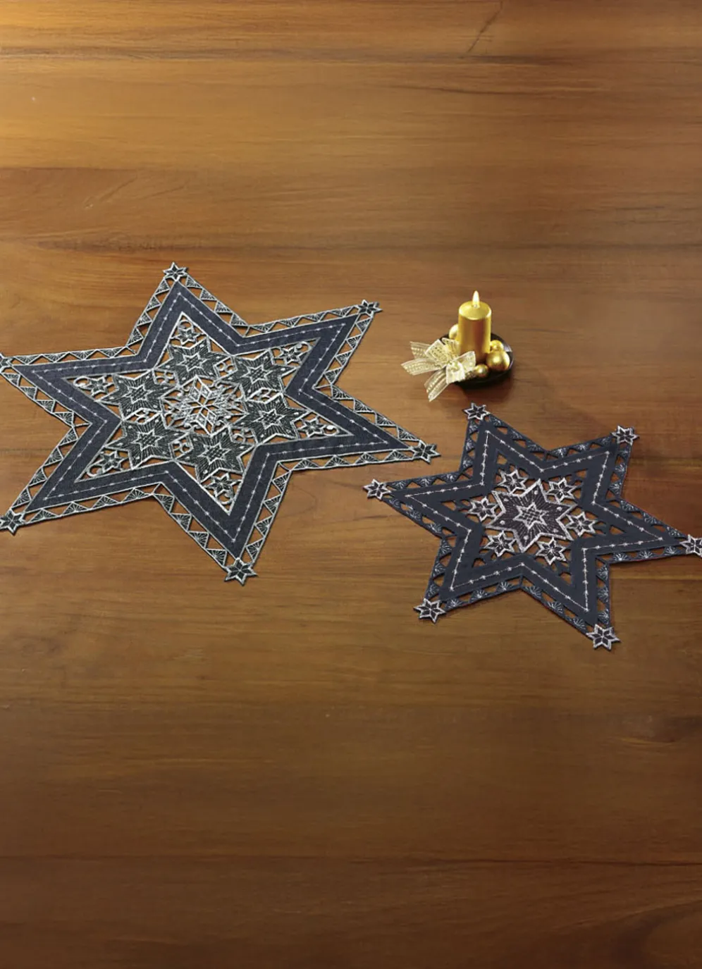 | Size | 130 (Stern, 2er-Set, ø 30 cm), 140 (Stern, 2er-Set, ø 40 cm), 150 (Läufer, 30/160 cm), 160 (Stern, ø 60 cm), 185 (Stern, ø 85 cm), 190 (Tischdecke, 85×85 cm) |