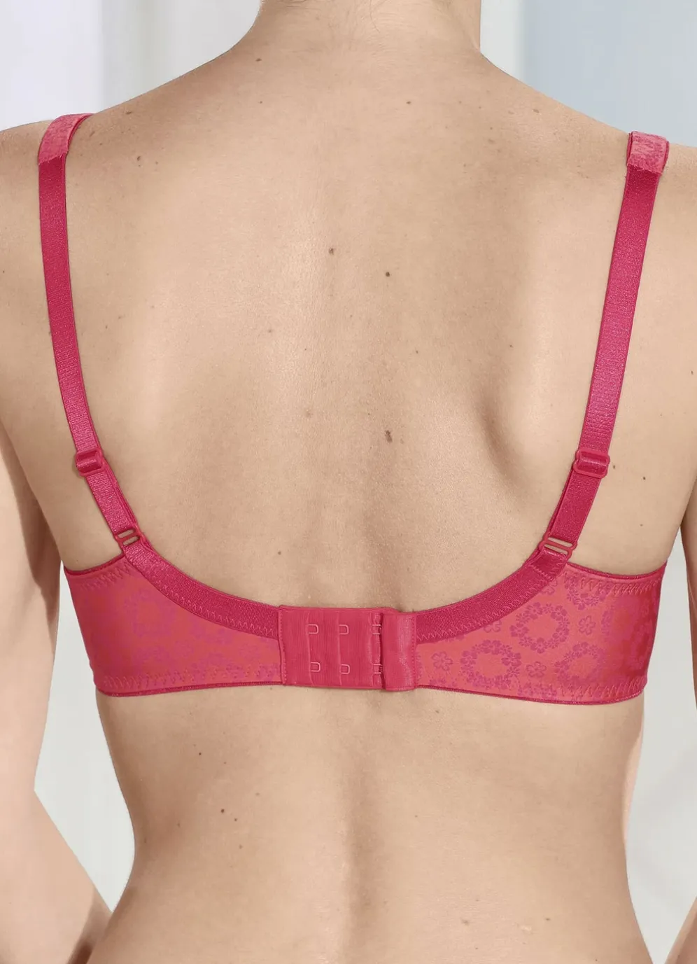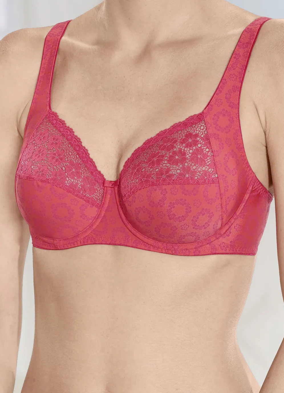 Zauberhafter, mohnroter „Format“-Bügel-BH mit farbharmonischem Blümchendessin, elastischer Spitze in den Obercups, unterlegten Untercups, verstärktem Rückteil sowie verstellbaren Stretchträgern.