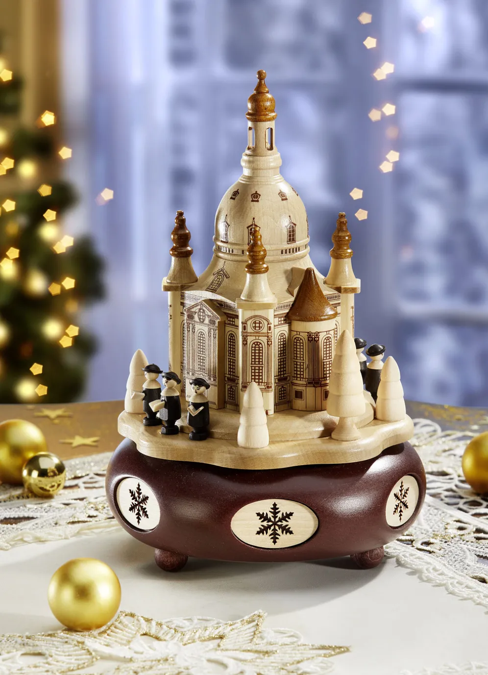 Handwerkskunst aus dem Erzgebirge: Spieldose „Dresdner Frauenkirche” mit 18-stimmigem Spielwerk, die sich zur Melodie von „Stille Nacht” dreht. Das Gehäuse ist mit viel Liebe zum Detail mit Schneeflocken verziert. Die Kurrende-Figuren, die Dresdner Frauenkirche und Bäumchen runden das Gesamtbild ab. Maße: ø 13 cm, Höhe 20 cm