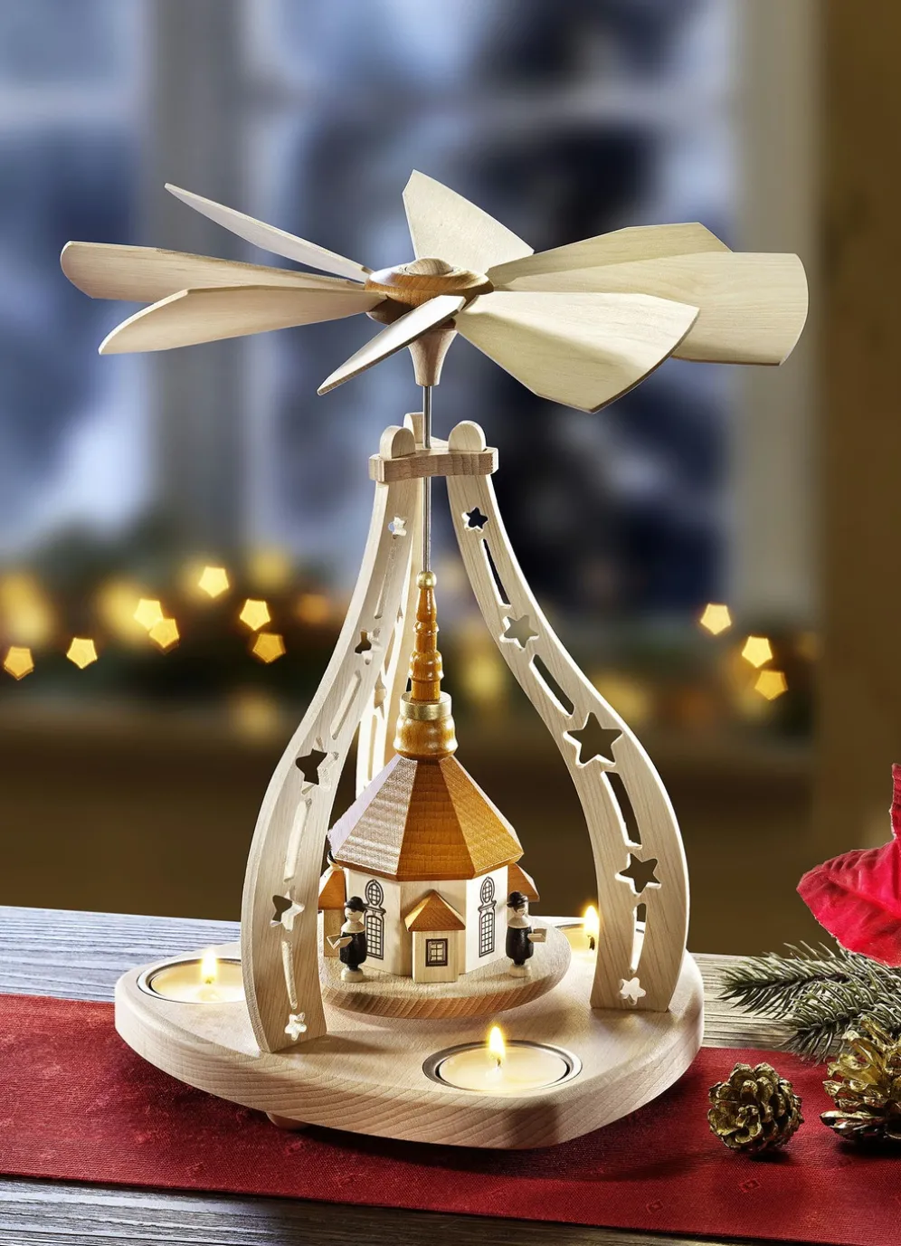 Eine hochwertige Handwerkskunst aus dem Erzgebirge ist diese Tischpyramide mit einer Seiffener Kirche und Kurrendefiguren in der Mitte. Aus Holz gefertigt. Die Lieferung erfolgt ohne Teelichter.