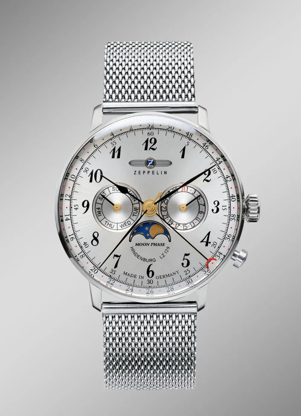Die Zeppelin-Quartz-Herrenuhr 7036M-1 Hindenburg Mondphase macht dank ihrem Durchmesser von 40 mm auch an Damen- oder schmäleren Herren-Handgelenken eine ausgezeichnete Figur, nicht zuletzt durch das feine Milanaise-Armband.