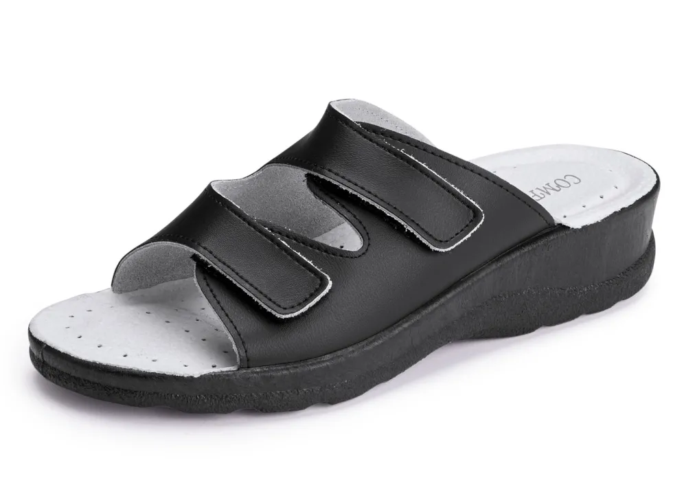 Pantoletten aus Nappaleder: in Weite H, zwei verstellbare Klettspangen, gepolstertes Lederfußbett, PU-Laufsohle sowie 30 mm Keilabsatz