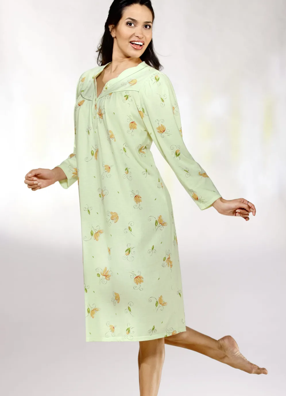 Allover dessiniertes, wadenlanges Nachthemd im preiswerten Zweierpack: mit Paspeln, Knopfleiste, Vorderpasse sowie Raffungen vorne und am Ansatz der langen Ärmel.