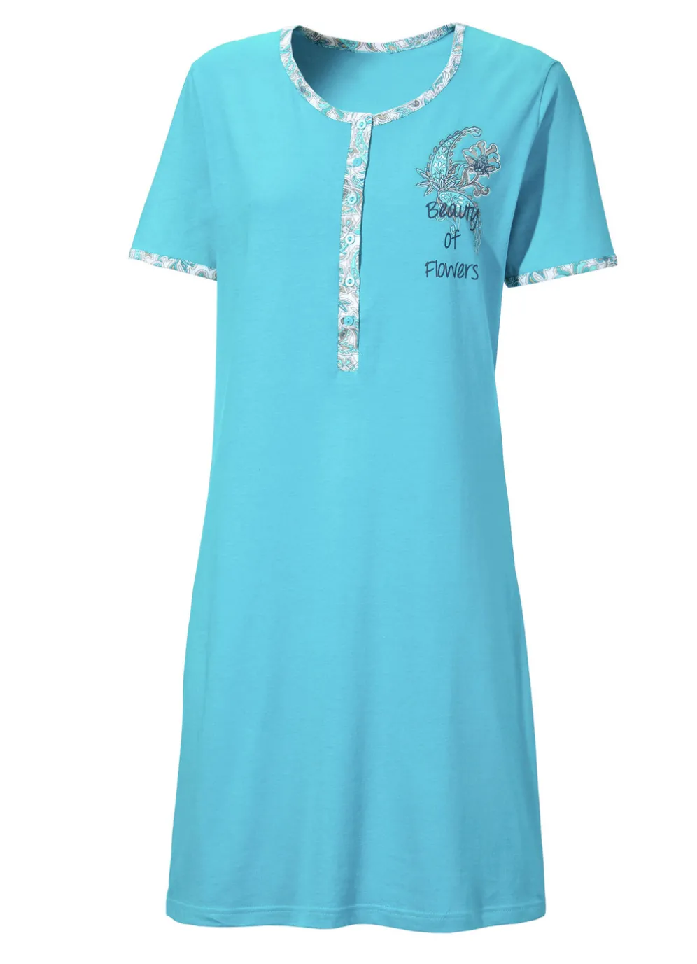 Zweierpack Nachthemden mit langer Knopfleiste, Stickerei sowie kurzen Ärmeln in 1X Fuchsia, 1X Lagune und in Größe 36.