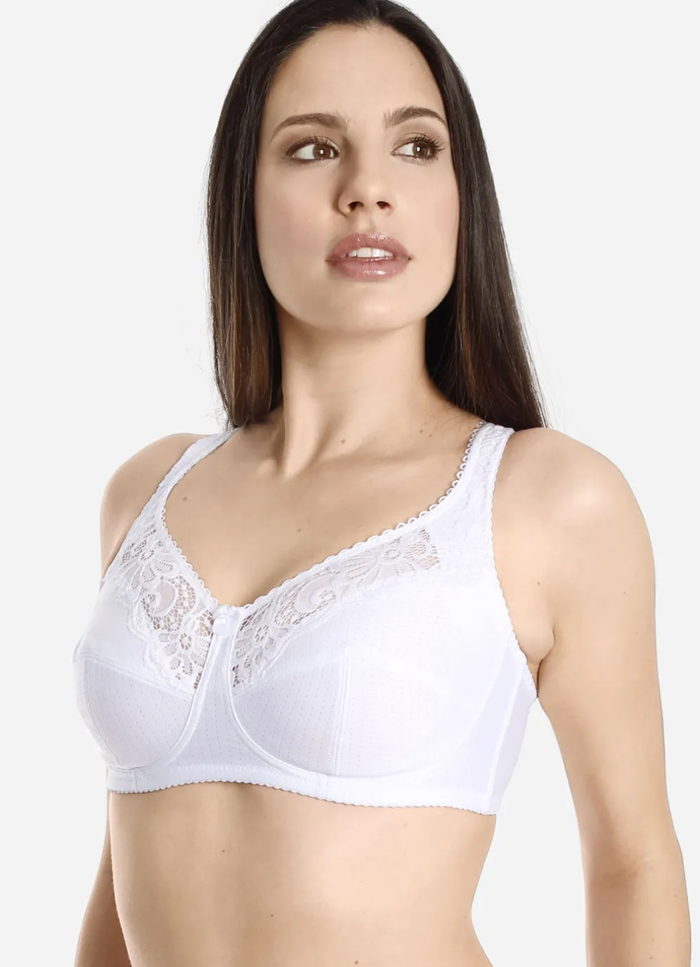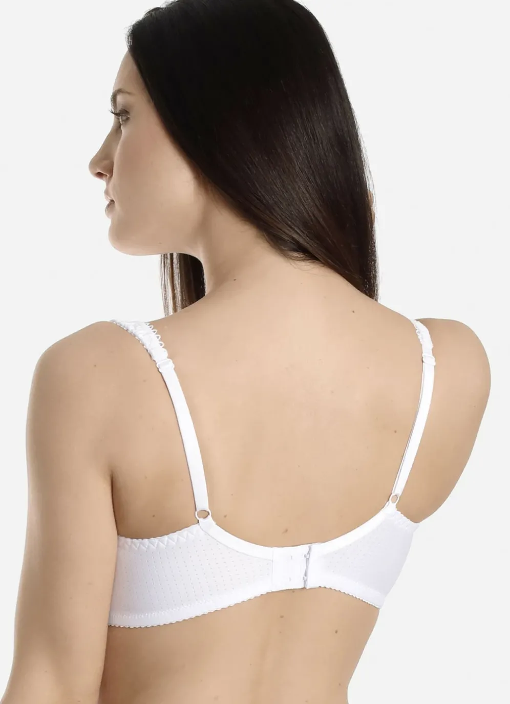 Dezent strukturierter „Sassa“-BH mit Elastikspitze am Dekolleté, unterlegten Cups mit seitlicher Verstärkung, seitlichen Stützstäbchen, verstärktem Rückteil sowie verstellbaren Stretchträgern.