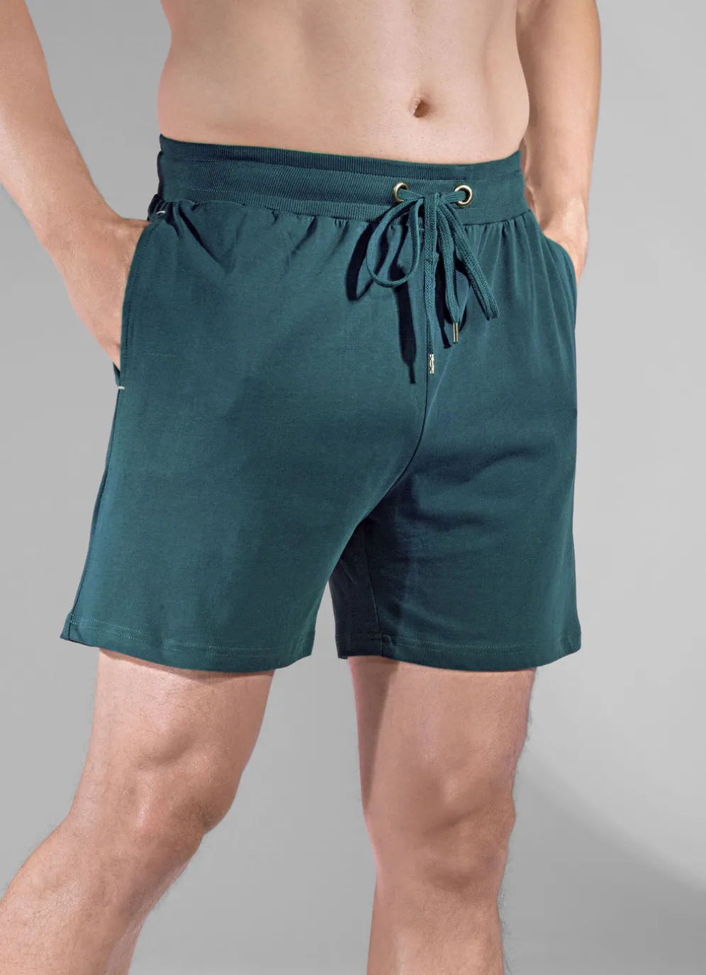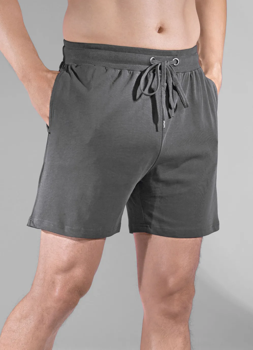 Zweierpack Schlaf- und Freizeithosen kurz mit Durchzugsband in 1X Petrol, 1X Anthrazit und in Größe 48.