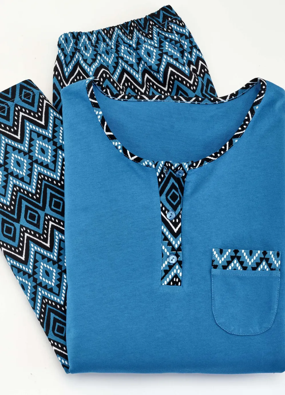 Pfiffiger Schlafanzug im preisgünstigen Zweierpack! Das Oberteil mit Einfassungen, Knopfleiste, Brusttasche mit Blende sowie langen Ärmeln. Lange Hose mit Dehnbund und offenen Beinabschlüssen.
