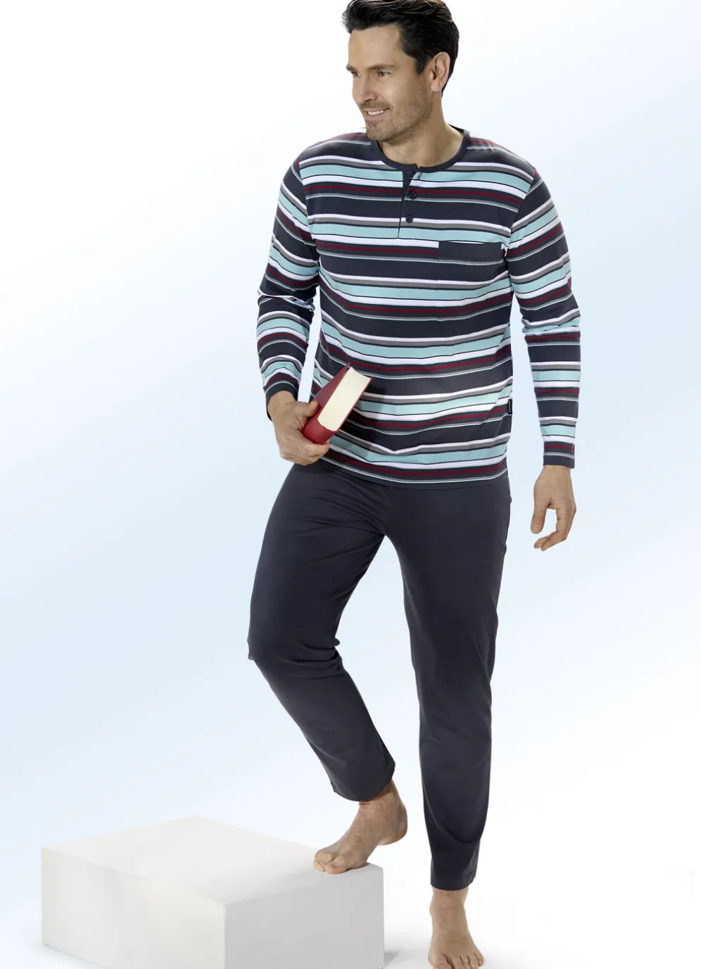 Vorteilhafter Zweierpack Schlafanzüge in tollen Farben! Oberteile mit garngefärbtem Ringeldessin, Knopfleiste, aufgesetzter Brusttasche sowie innerem Rückensattel. Lange Hosen mit auswechselbarem