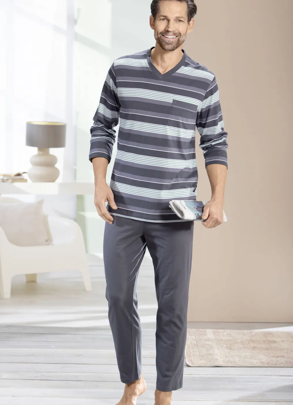 Zweierpack Schlafanzüge mit V-Ausschnitt und offenen Abschlüssen in 1X Grafit-Grün-Bunt, 1X Marine-Cognac-Bunt und in Größe 46.