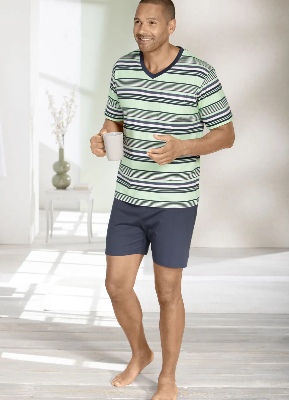 Schöne Shortys im Zweierpack: Oberteile mit Ringeldessin, V-Ausschnitt, aufgesetzter Brusttasche sowie innerem Rückensattel. Die Shorts mit auswechselbarem Gummizug im Bund.