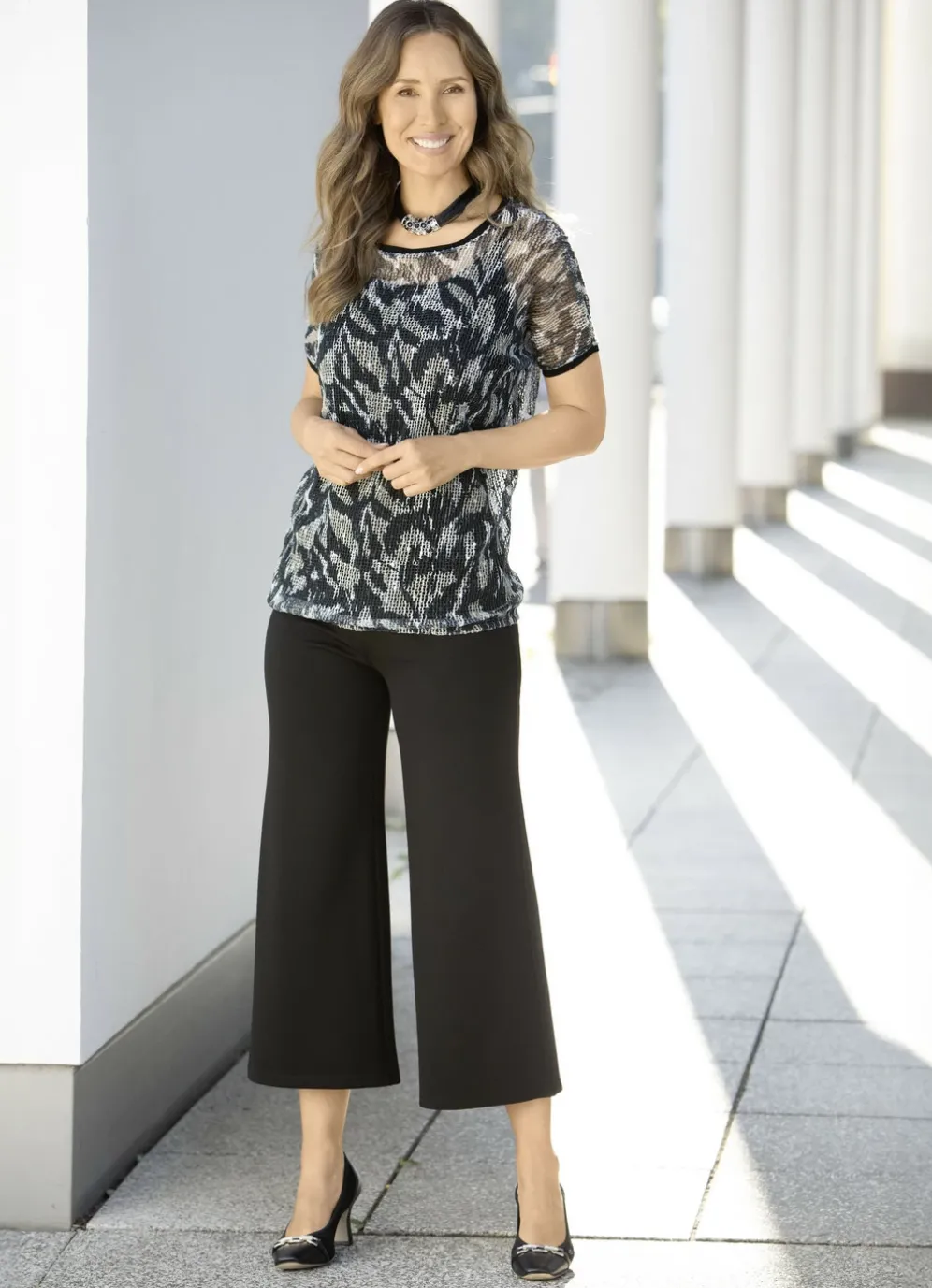 Jedes Teil ein Unikat! Exzellentes 2-teiliges Set: Shirt in Schwarz-Beige-Ecru allover mit dezenter Paillettenzier, Rundhals und überschnittene Schulterpartie mit schwarzem Einfass, Gummizug am Saumabschluss.