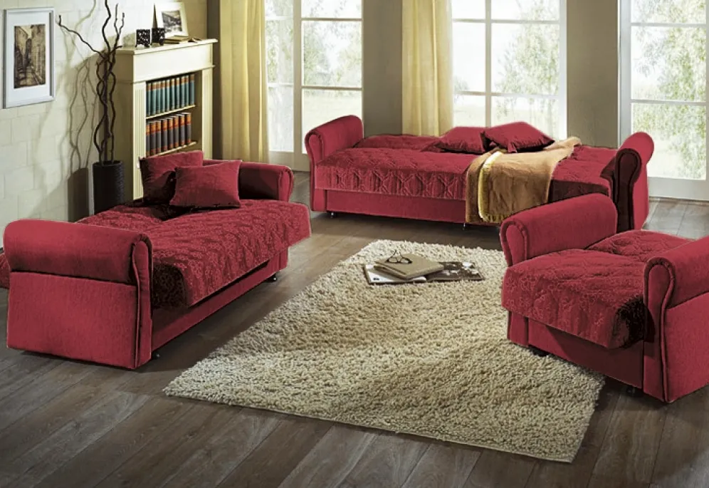 3-teilige Polstergruppe mit Bettkasten in der Ausführung Dreisitzer und 2 Sessel und in Bordeaux.