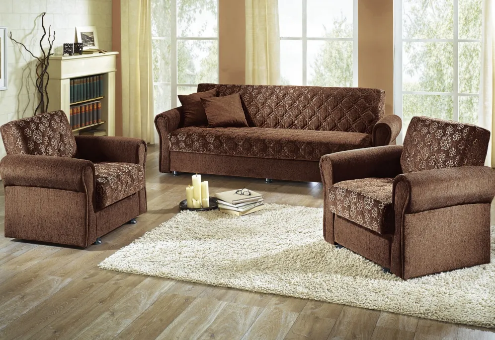 Schicke Polstergruppe mit praktischer Kippfunktion, die aus einer Sitzgelegenheit schnell und einfach eine gemütliche Schlafgelegenheit zaubert. Mit 4 dekorativen Kissen (35×35 cm), hochwertigem Federkern in den Sitz- und Rückenflächen sowie Bettkasten für Decken und Kissen. Weicher und pflegeleichter Bezugsstoff aus 86%Polyester, 6% Viskose und 8% Baumwolle.Der Zweisitzer sowie der Sessel ist mit Originalstoff und der Dreisitzer mit einem Spannstoff bezogen.