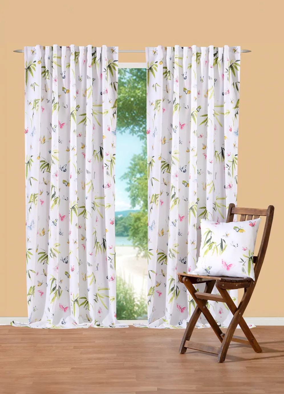 Zarte Schmetterlinge tummeln sich auf diesem bedruckten, 3-teiligen Gardinen-Set. Mit Multifunktionsband zur Aufhängung an der Gardinenschiene oder Gardinenstange.