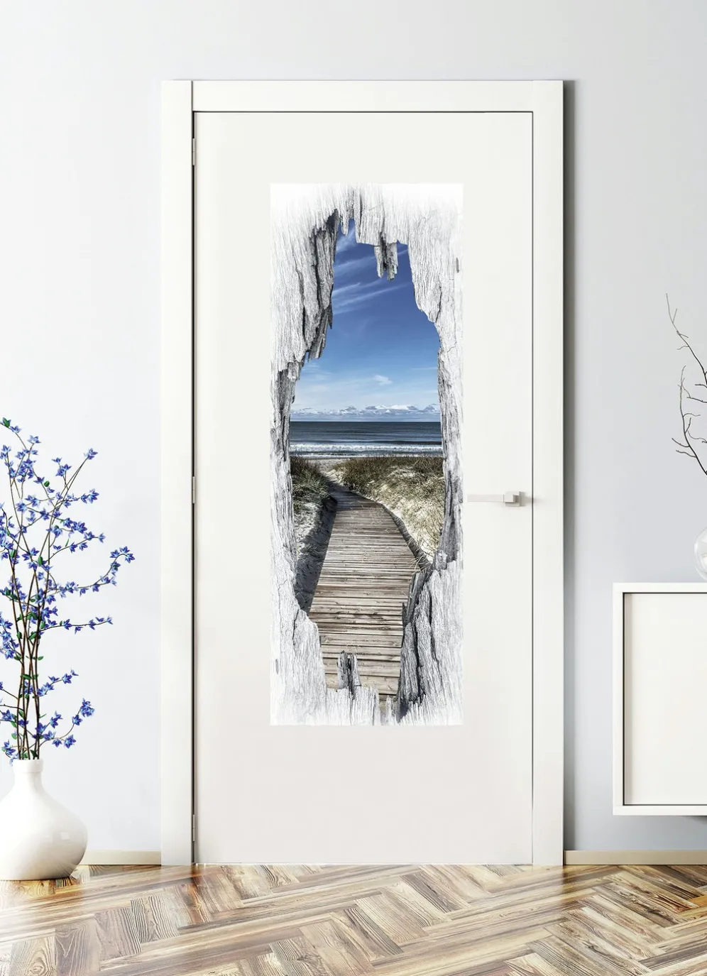 3D-Tür-Sticker Strand nordisch in Blau.