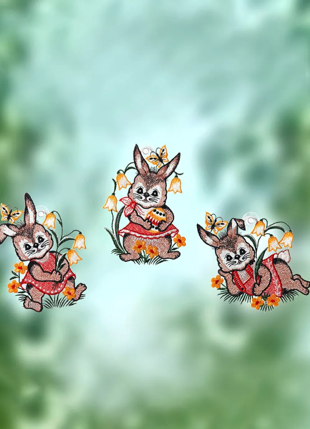 Drei Häschen lassen es sich auf einer Frühlingswiese mit Ostereiern, Blumen und Schmetterlingen so richtig gut gehen. Dieses Set aus echter Plauener Spitze sollte unbedingt an Ihrem Fenster hängen! Qualität: 100% Polyester. Mit Saughaken zur einfachen Befestigung.