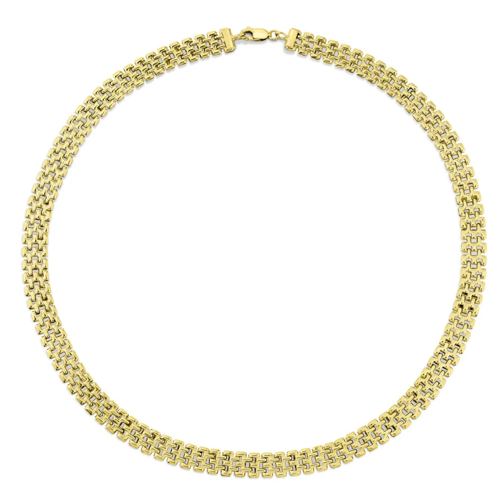 Elegant und attraktiv sind diese Halskette oder dieses Armband in 5-reihigem Backstein-Design, die Sie wahlweise in Gold 585/- fein oder Gold 333/- fein erhalten. Bei besonderen Anlässen lassen Sie diese Schmuckstücke in schwerer, hochwertiger Ausführung in umwerfendem Glanz erstrahlen. Die Breite beträgt 8 mm. Als Verschluss dient ein Karabiner mit Anstössen. Dieser Schmuck wird Sie auf Anhieb begeistern!