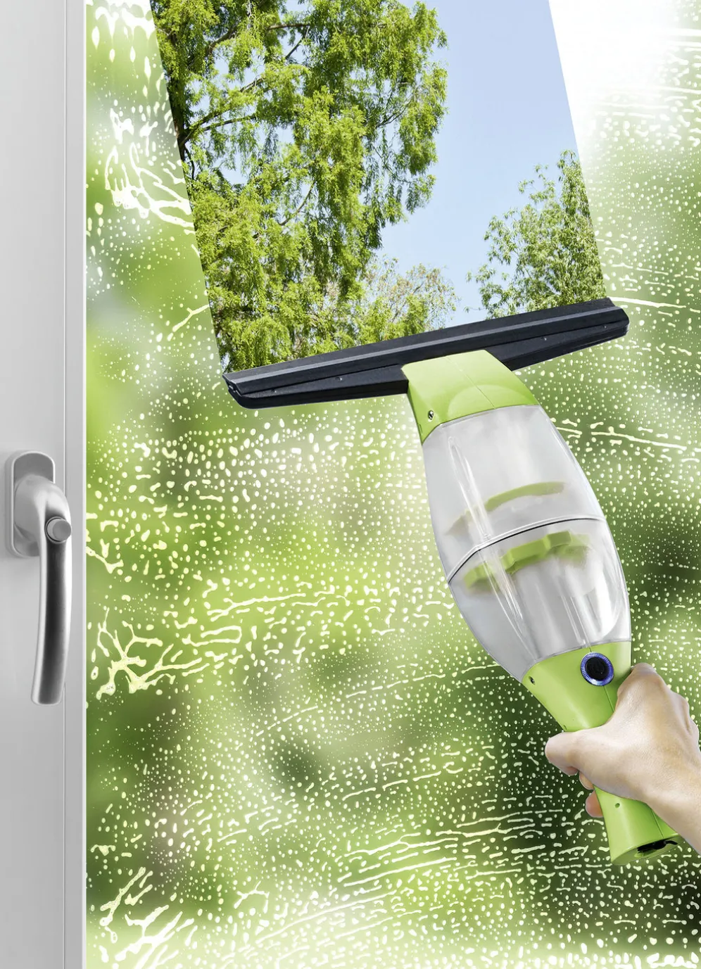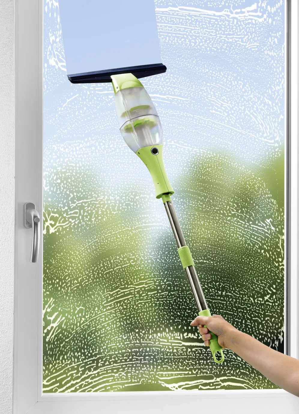 für streifenfreie Reinigung von glatten Flächen wie Fenstern, Spiegeln, Fliesen oder Duschkabinen. Kein herabtropfendes Schmutzwasser dank Wasserabsaugung. Mit spezieller Fensterlippe 28cm breit. Handlich und leistungsstark. 100-ml-Schmutzwassertank. Leicht zu entleeren. 3,7-V-Lithium-Ionen-Akku (kein Memory-Effekt): für 30 Minuten Betriebsdauer. Mit 350-ml-Sprühflasche mit zwei extra weichen Mikrofaserwischbezügen (waschbar bis 40°C). Zusätzlich mit Verlängerungsstange (Länge 51cm) ideal für schwer erreichbare Flächen wie Wintergärten oder Dachfenster. Maße: B28xH38xT7,5 cm.