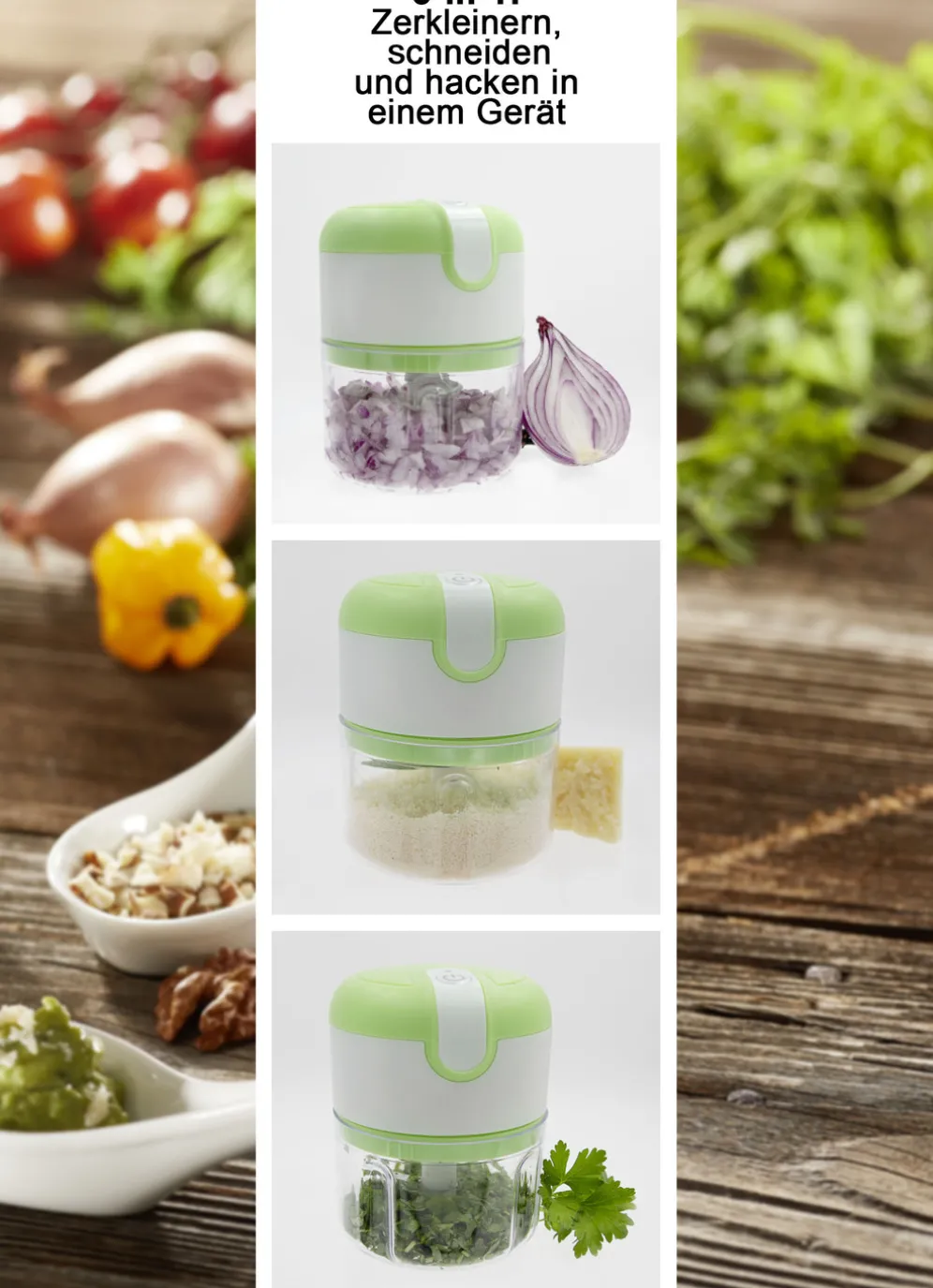 Zerkleinern, schneiden und hacken in einem kleinen Gerät mit dem Livington 3 Seconds Chopper. Der kompakte, kabellose Power-Zerkleinerer zerkleinert alles restlos dank den bis zu 1.600 Umdrehungen/ Minute und den 3 Klingen auf 3 Ebenen in nur 3 Sekunden. Durch die komfortable Einhand-Bedienung zerkleinern Sie im Nu auf Knopfdruck Nüsse, Käse, Kräuter, Zwiebeln, Obst uvm. Das Multitalent findet in jeder Schublade Platz und ist nicht größer als ein Kaffeebecher. Seine hochwertigen Edelstahlklingen zaubern in Windeseile leckeres Pesto, nahrhaften Babybrei oder köstliche Dressings und Salsa. Einfach per mitgeliefertem USBKabel wieder aufladen. Einfache Reinigung, Behälter, Spritzschutz und Klingen sind spülmaschinengeeignet.