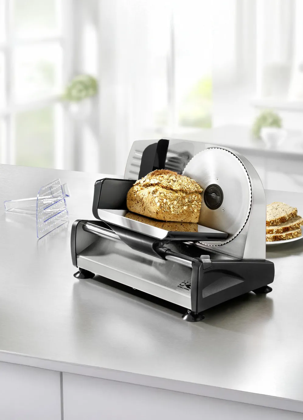 Allesschneider aus hochwertigem Edelstahl in Silber.
