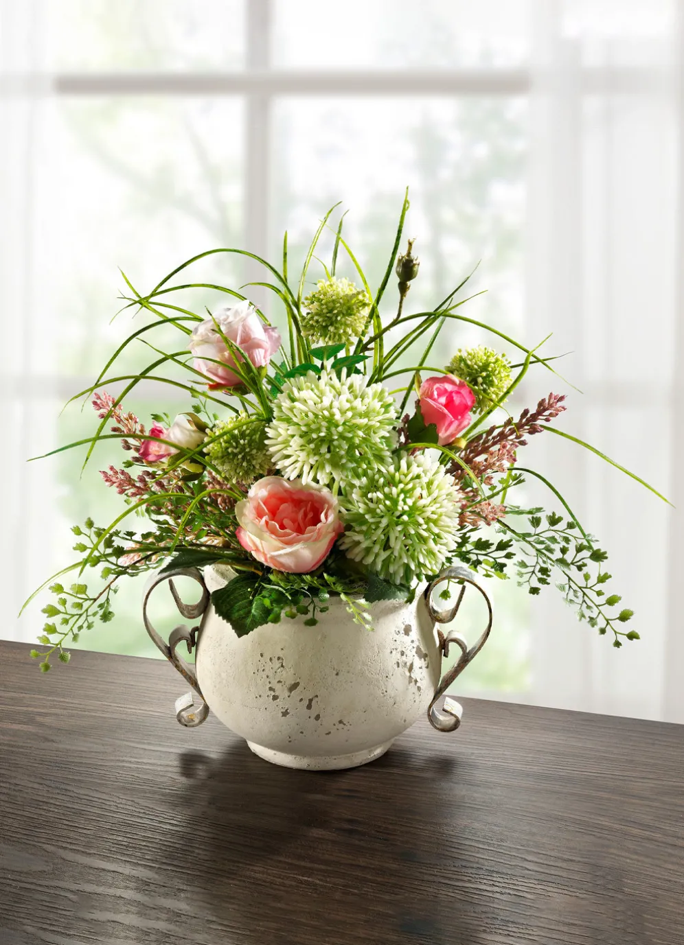Prächtige, cremefarbende Allium-Blüten sowie rosafarbene und weiße Rosen sind mit Gräsern fest in einen antiken Topf aus Ton mit Henkeln eingesetzt – ein romantischer Blickfang in Ihrem Zuhause! Aus hochwertigem Kunst- und Textilmaterial gefertigt. Maße: Höhe 35 cm; Topf B21xH11,5xT14 cm.